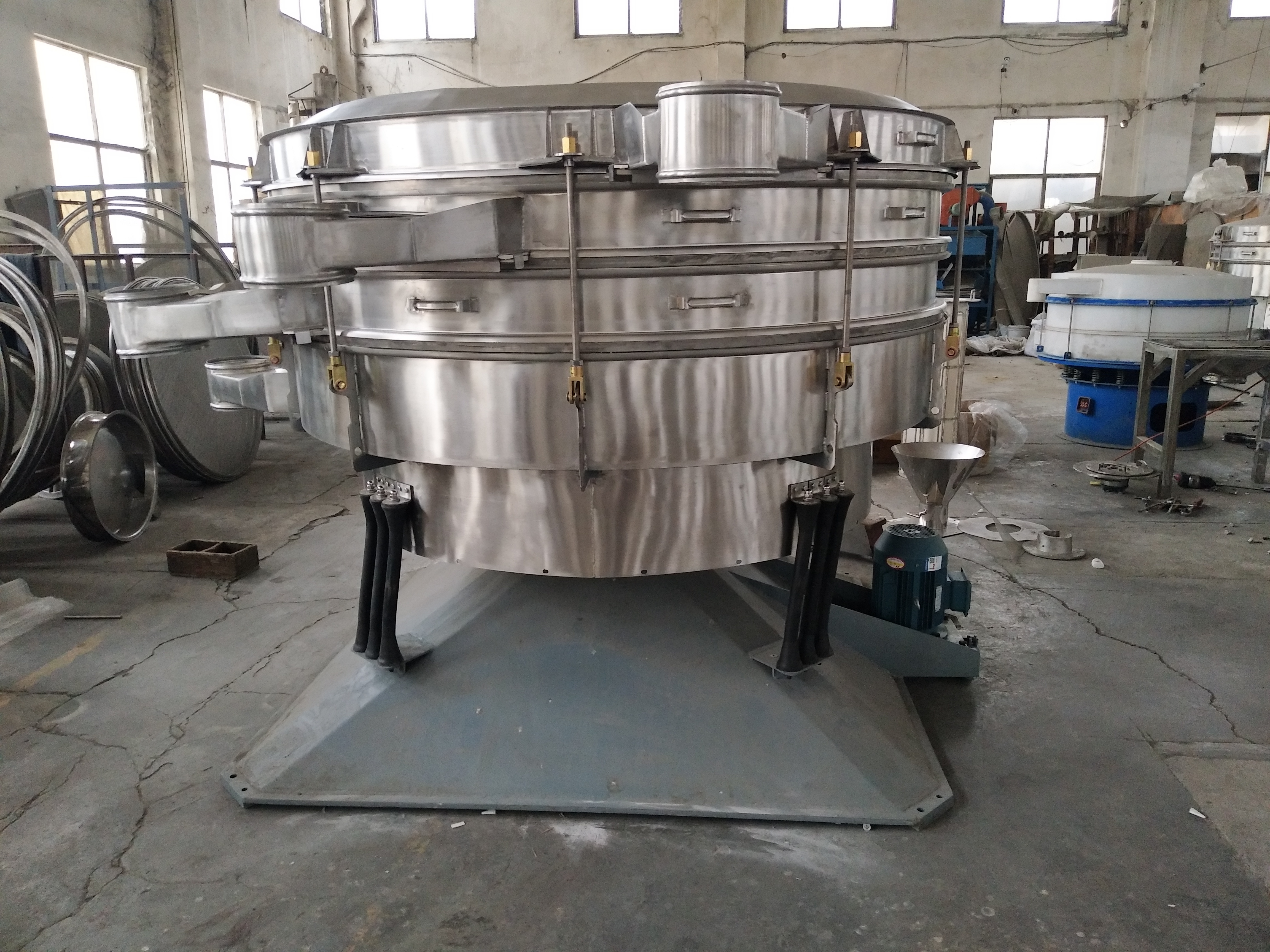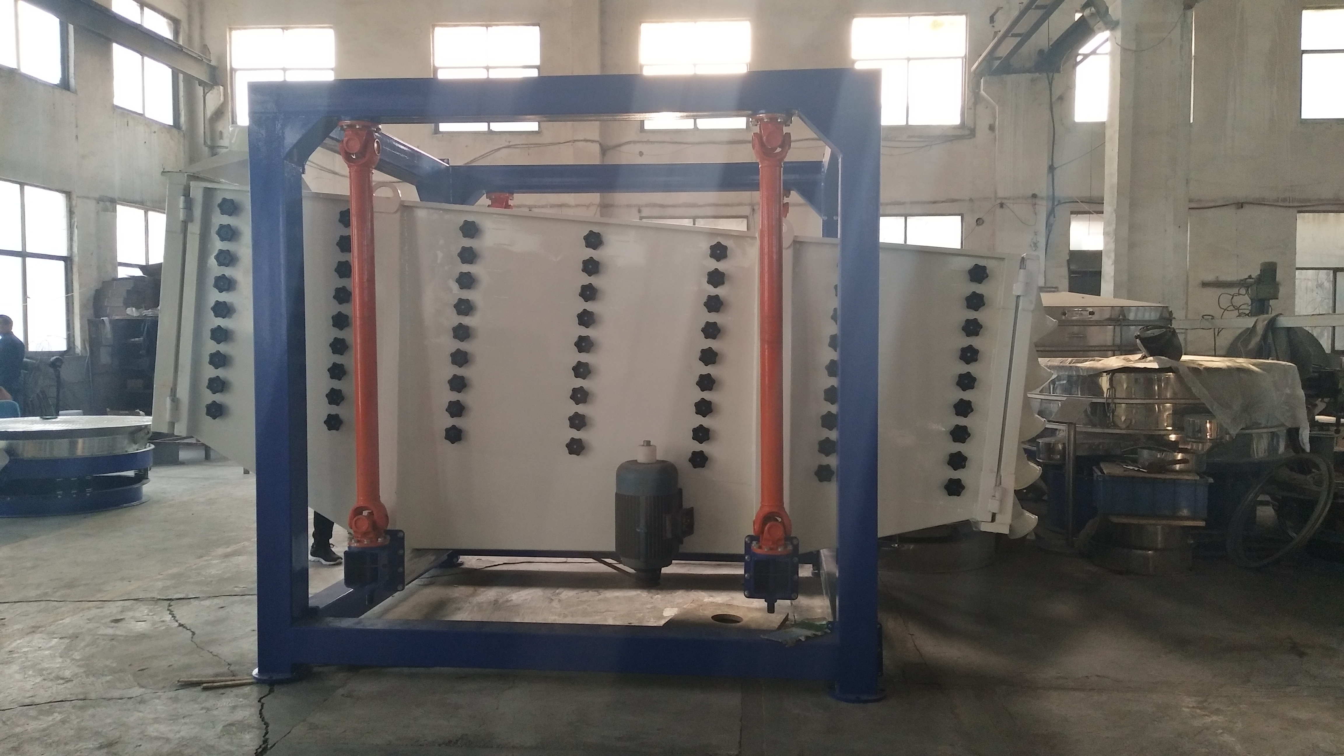 200°以下溫度的物料用什麽篩粉機效果好 有朋友問200°以下溫度的物料用什麽篩粉機效果好今天針對這個問題做下分享,讓您了解200°以下溫度的物料用什麽篩粉機效果好相關信息和答案! 200°以下溫度的物料篩分機采用雙振動電機驅動,當兩台振動電機做同步、反向旋轉時,其偏心塊所產生的激振力在平行於電機軸線的方向相互抵消,在垂直於電機軸的方向疊為一合力,因此篩機的運動軌跡為一直線。其兩電機軸相對篩麵有一傾角,在激振力和物料自重力的合力作用下,物料在篩麵上被拋起跳躍式向前作直線運動,從而達到對物料