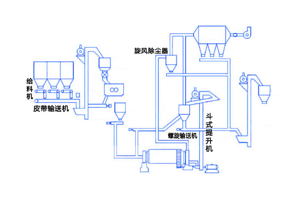 【生產流程描述】1、骨料烘幹:A、三回程烘幹機,小時產量100噸。2、變頻調速皮帶輸送機機供料,依據骨料潮濕程度調整供料速度,確保出料含水率和烘幹產量的匹配。3、袋式除塵器、高通風,提高除塵效果,保護環境。布袋除塵兩級分離除塵,排除的廢氣經過脫硫塔脫硫。4、粉體料分別螺旋輸送機喂料到秤鬥計量。5、根據當地條件選用熱源。有兩種選擇,一是配件沸騰爐,用以燃燒生物燃料或煤炭;二是配做燃燒室,用以燃燒天然氣或油。6、烘幹的骨料經過篩分去粗後進入鬥式提升機。篩分機可選用振動篩或圓筒篩。經過攪拌混合圴勻的物料從攪拌機卸入成品鬥,通過氣動三通分為兩路:一路直接經過散裝機進入散裝車運往工地。另一路經過螺旋輸送到包裝過度倉包裝。